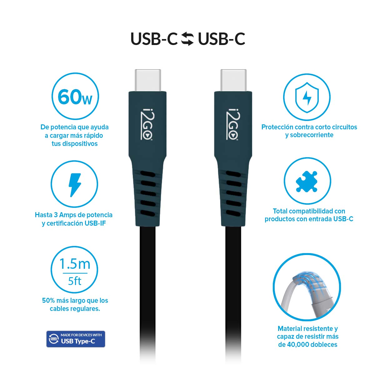 Con un conector de alta velocidad y material de alta resistencia capaz de soportar más de 40,000 dobleces, ofrece hasta 60W de potencia. Certificado por USB-IF, garantiza la seguridad en la conexión y carga de tus dispositivos. Con 1.5 metros de longitud, es perfecto para todas tus necesidades de carga y transferencia de datos. ¡Hazte con el tuyo y disfruta de durabilidad y rendimiento inigualables!