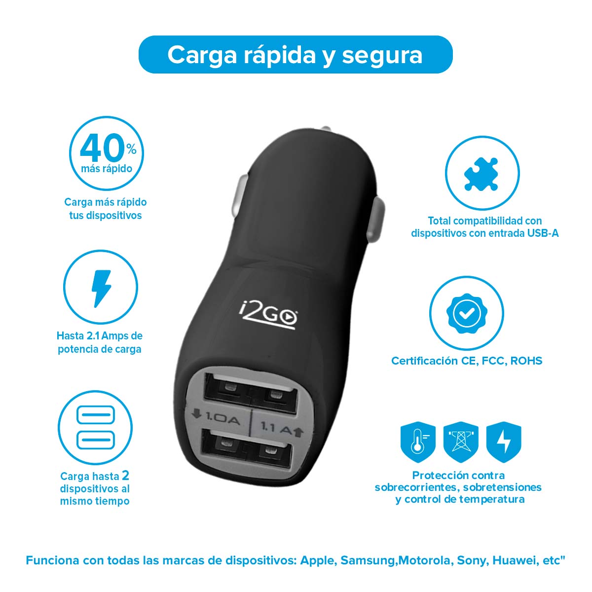 Con dos entradas USB, carga hasta dos dispositivos al mismo tiempo, ideal para smartphones, tablets o GPS en tu carro. Aumenta la velocidad de carga en un 40% y ofrece protección contra sobrecargas, altas temperaturas y cortocircuitos. Certificado por CE, FCC y ROHS, garantiza máxima seguridad y calidad. Compatible con todas las marcas de dispositivos como Apple, Samsung, Motorola, Sony, Huawei y más. ¡Elige DualSpeed Pro para una carga rápida y segura!