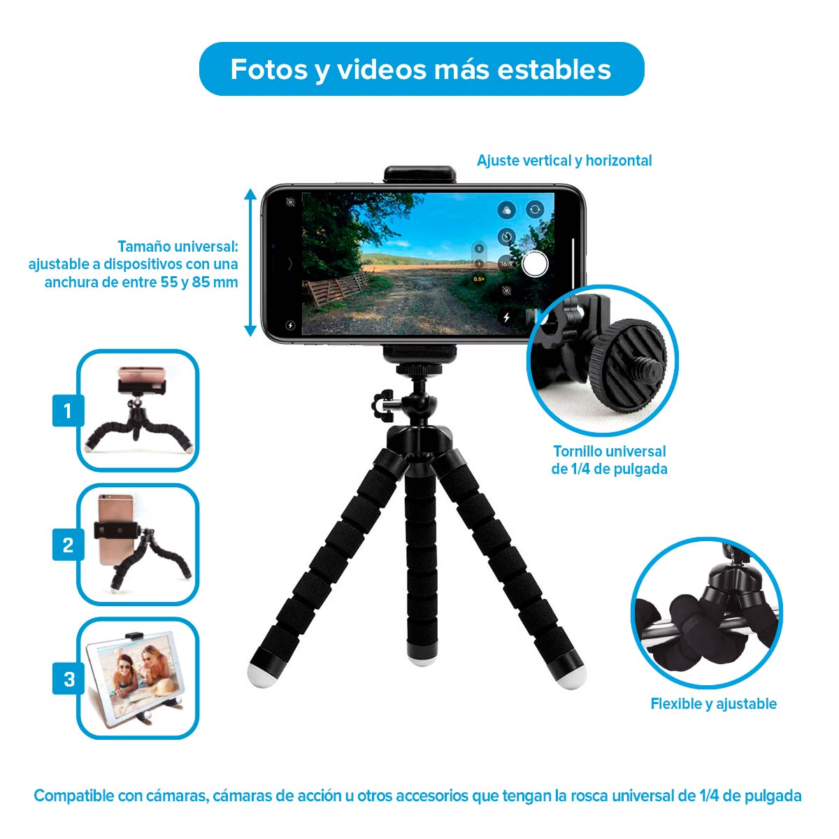 Flexible y seguro, sus varillas se doblan para ajustarse a donde quieras. Permite ajuste horizontal y vertical con tamaño ajustable de 55mm a 85mm. Fabricado con material premium y resistente, ofrece compatibilidad universal con dispositivos como iPhone, Samsung Galaxy, cámaras digitales y GoPro. ¡Elige FlexMount Pro para un soporte versátil y confiable, ideal para cualquier dispositivo y situación!